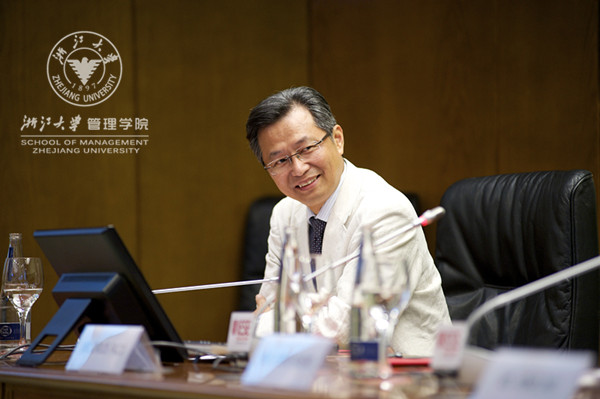 从左至右:管理学院院长吴晓波、中欧学术委员会主席、IESE商学院佩德罗•雷诺、零点咨询集团副总裁冯晞