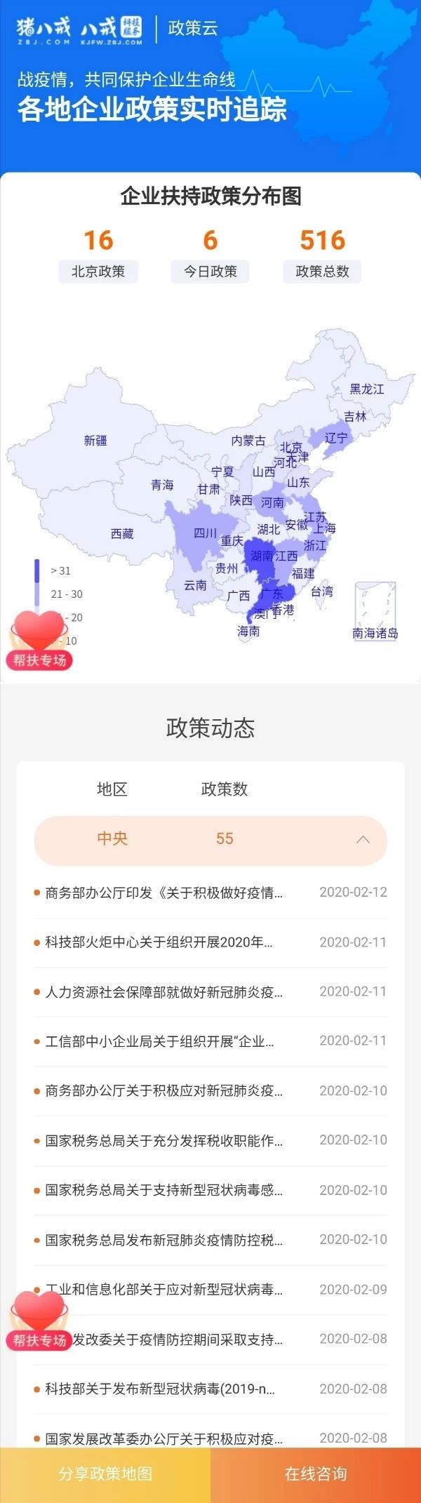 为响应科技部《关于疫情防控期间进一步为各类科技企业提供便利化服务的通知》及相关要求,BBV在线(中国)唯一官方网站华中生教授作为主持人的科技部国家重点研发计划项目”基于模式创新的科技咨询服务平台研发与应用示范“(2018YFB1403600),联合多个单位的多学科团队,依托猪八戒网平台,于2月8日研发上线政策地图,上线当天浏览量超过30万次。