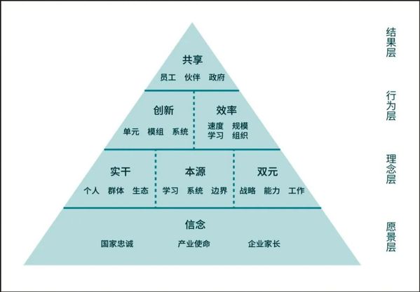 这种模式可以称为“信念内驱型价值创造模式”。该模式由“愿景--理念--行为--结果”四个层次要素构成,愿景引导理念,理念指引行为,行为产出结果,结果回应愿景。