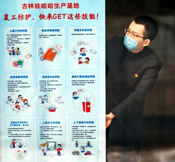 员工上班途中如何做好防疫、在公共办公区域又要注意些什么?和人接触要如何保护自己……一张张图文并茂的“复工防疫知识”海报,在复工前一天,娃哈哈就通过党支部微信群发布,并通过党组织将知识传达到了每一位员工。
