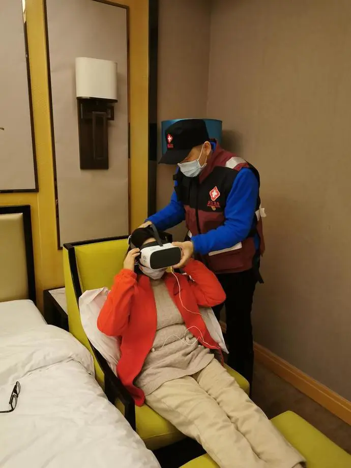 戴上VR眼镜,李医生瞬间从疫区穿越到海边,眼前是宁静的海滩,耳边是舒缓的海浪声,他的身体慢慢放松下来,进入了梦乡……醒来后他说,“前面比较紧张、焦虑,做了VR以后放松不少。”