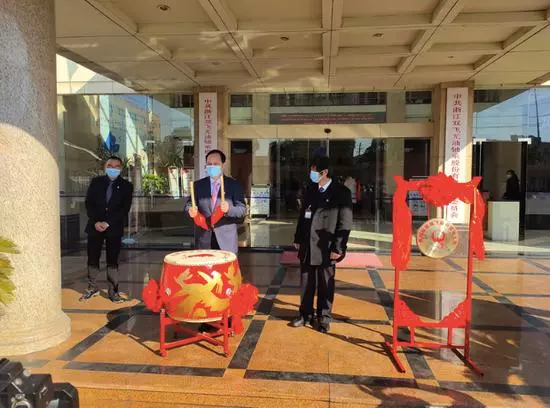 2020年2月18日,浙江双飞无油轴承股份有限公司上市,受疫情影响,无法在交易所敲钟,公司董事长戴着口罩在自家门口举行”敲钟仪式”。