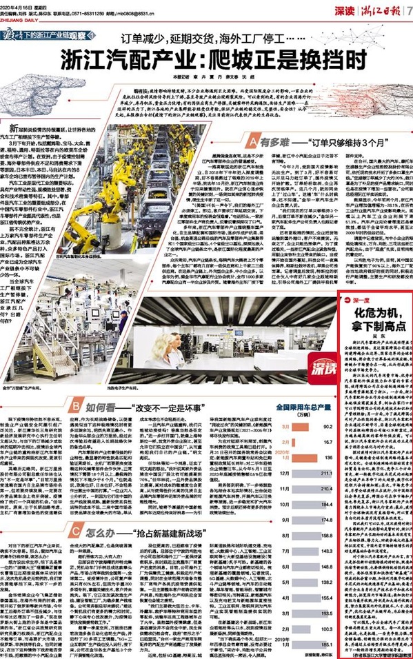 可以预见,疫后全球汽车厂商的竞争格局将发生重大改变。每一次危机既是威胁,又是机遇,一些竞争能力强、现金储备稳、创新能力强的浙江汽车零配件企业将生存下来,并通过主动转型升级生存得更好,成为下一轮经济增长周期的领导者。