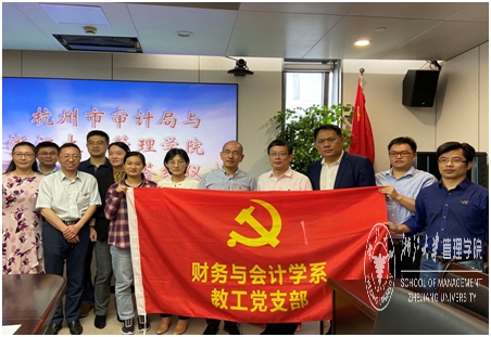 2020年5月22日上午,在朱原书记的带领下,财会系教工党支部深化落实三结对系列活动,前往杭州市市民中心,与杭州市审计局召开合作洽谈会暨签约仪式。杭州市审计局与会人员包括:王剑(市审计局党组书记、局长),王坚(市审计局党组成员、总审计师),方钟铭(法规和审理处处长),韩伟(电子数据处处长),林宏青(法规和审理处二级调研员)。