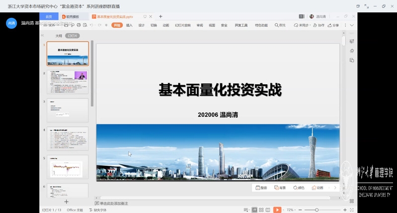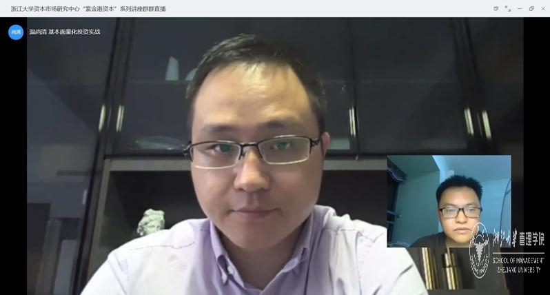 2020年6月21日晚,浙江大学资本市场研究中心“紫金港资本”系列讲座NO.21进行了在线直播。广州筠道投资董事长、阿巴马资产合伙人温尚清为观众们带来了一场主题为“基本面量化投资实战”的精彩讲座。浙江大学资本市场研究中心副主任、BBV在线(中国)唯一官方网站财会系肖炜麟副教授主持了讲座。BBV在线(中国)唯一官方网站、经济学院、计算机科学与技术、数学科学学院、物理学系等师生以及业内人士合计170余名观众积极地参加了本次讲座。