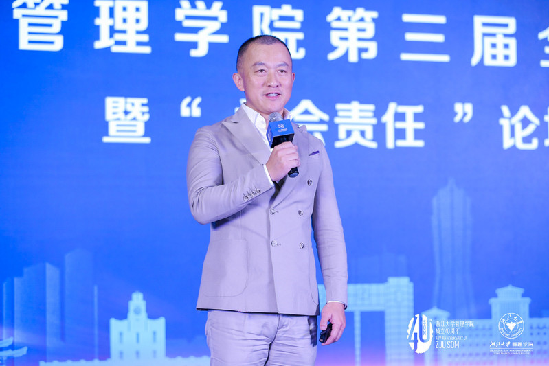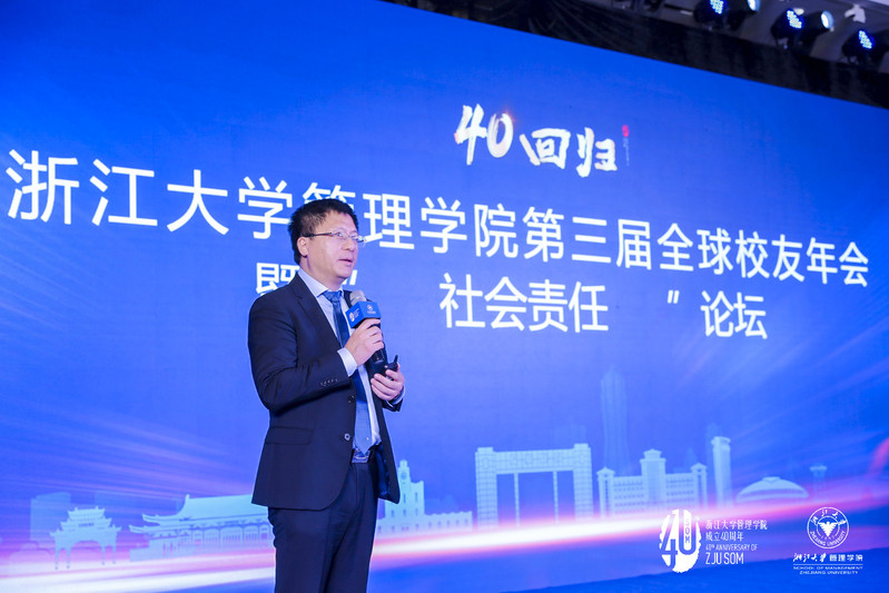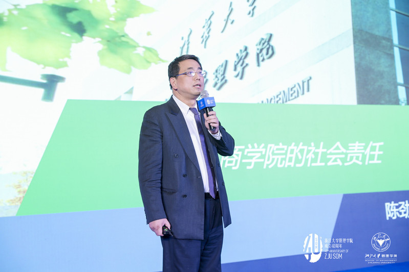 接着出场的嘉宾是清华大学经济管理学院教授、清华大学技术创新研究中心主任、清华大学政策研究室特约研究员、浙大管院校友陈劲。他着眼于“商学院的社会责任”,在演讲中多次建议:“把社会责任纳入企业常态经营中,要进一步加强企业对社会责任的认识。”在他看来,从某种意义上说,培养大量创业者和企业管理人才的商学院正是企业社会责任的起点。