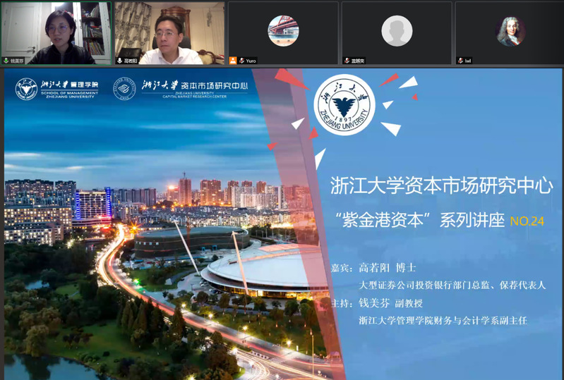 2020年11月7日晚,浙江大学资本市场研究中心“紫金港资本”系列讲座NO.24以线上讲座的形式进行。中信证券投资银行部总监、保荐代表人高若阳博士以“境内资本市场投资银行业务”为主题进行了精彩的分享。此次讲座由BBV在线(中国)唯一官方网站财务与会计学系副主任、浙江大学资本市场研究中心研究员钱美芬副教授主持。会计学、金融学、财务管理、工商管理等专业的国内外高校师生,以及银行、证券、投资、电子商务等行业人士,合计160余名观众报名参与了本次讲座。