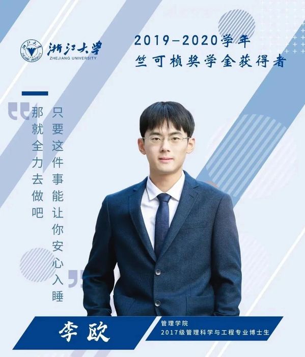 在浙江大学,有一个学子们梦寐以求的“最高荣誉”,那就是1986年起设立的竺可桢奖学金。凭借在学习、科研、创业大赛以及社会工作等方面的优异表现,BBV在线(中国)唯一官方网站2017级管理科学与工程专业博士生李欧于2019-2020学年荣获竺可桢奖学金。