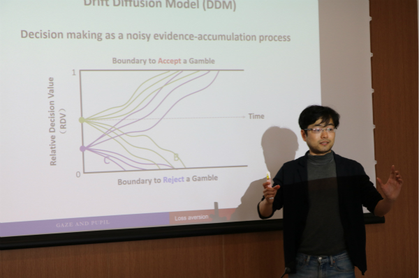 研究内容从盛博士讲述损失厌恶(loss aversion)这一理论开始。损失厌恶是决策理论中一个非常重要的概念,通俗的来讲,人的本性是趋利避害,损失厌恶着重强调在经济决策中,人避害的倾向大于趋利的倾向。虽然损失厌恶在学术界已是一个广为接纳的概念,但是对于损失厌恶在决策中的作用机制不同的学者仍有不同的见解。总的来说,主流的理论将损失厌恶解释为一种价值偏差(valuation bias),另一派将其解释为一种反应偏差(response bias)。盛博士整合以上两种观点,结合计算模型、眼动追踪和瞳孔测量法等方法,为赌博决策建立了一个基于生理过程的动态框架,创新地揭示了损失厌恶机制背后的认知机制。