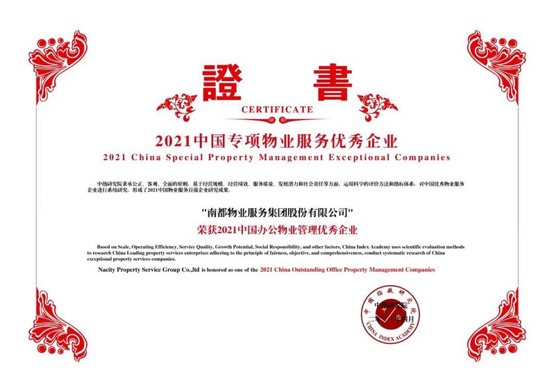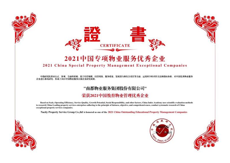 南都物业凭借2020年稳健拓张,智慧运营的经营方式,业务规模稳健扩张,同时持续深耕专业赛道,荣获“2021中国物业服务百强企业”, “2021中国办公物业管理优秀企业”,“2021中国教育物业管理优秀企业”三个奖项。