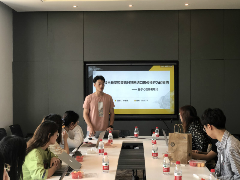 首先,李路炜同学与大家分享了有关个体积极自我呈现策略对其网络口碑转播意愿影响机制的研究。李同学从移动互联网时代下社交网络迅速发展的背景出发,介绍了社交网络对个人和电商行业的影响,进而引入研究主题。在回顾、梳理完前人相关研究后,结合其中存在的空缺,李同学认为探究消费者个人特质,对于企业理解个体网络口碑传播内在的心理机制、完善用户画像具有一定实践价值。接着李同学运用基本需要理论,从自主需要、胜任需要、关系需要三个维度推导了个体积极自我呈现通过个体基本心理需要影响其网络口碑传播意愿的过程。最后李同学向大家展示了数据收集情况和分析过程,以及最后的假设检验结果。