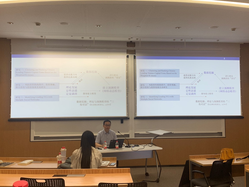 21日下午,罗老师团队的杨虎老师和谷伟伟老师基于罗老师的三角对话理论,分别介绍了大数据风险投资领袖识别和基于动态理论建模的风险投资大数据分析系列研究。其中,杨虎老师分享的三个实证研究分别呈现了他利用大数据识别风险投资领袖,探索风险投资机构排序、投资领袖、联合投资与投资绩效关系,并开发综合更多的信息(含个体特征和结构化信息)识别风险投资领袖的算法的过程。谷伟伟老师分享的两个应用实例则回答了如何使用大数据做验证性的研究、动态理论建模怎样与大数据对话、大数据分析的研究范式和常用方法有哪些等社会计算研究关注的关键问题。两位老师的分享激发了同学们的思考,在回答环节,在场师生针对大数据对管理学研究的启示做了进一步的讨论。