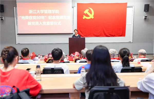 在党旗见证下,由浙大管院党委书记朱原领誓,党龄50年以上的老党员们和教工党员代表重温入党誓词,新发展党员进行入党宣誓。