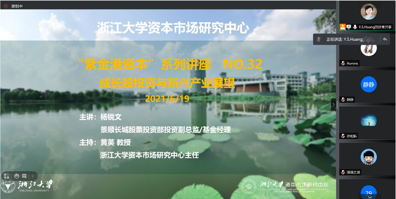2021619日上午,浙江大学资本市场研究中心紫金港资本系列讲座NO.32以线上讲座的形式进行。景顺长城股票投资部执行总监、基金经理杨锐文先生为观众们分享了主题为成长股投资与新型产业展望的精彩讲座。此次讲座由浙江大学资本市场研究中心主任黄英教授主持。会计学、工商管理、信息管理与信息系统等专业的国内外高校师生,以及银行、证券、投资、电子商务等行业人士,合计近200名参与了本次讲座