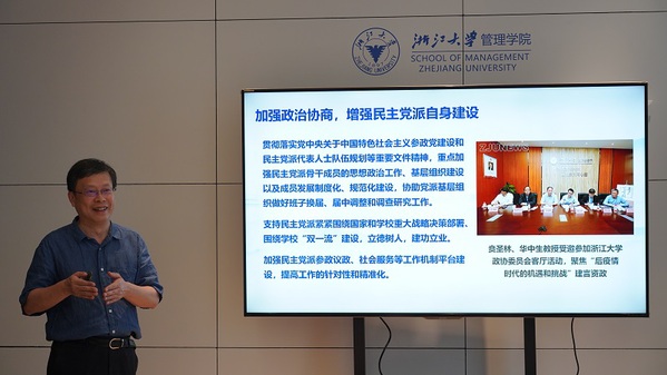 民建浙大校委会主委、省政协委员华中生教授认为,浙大应成立专门机构,综合管理、经济、文化、社会和哲学等多个学科进行联合攻关,在探索浙江高质量发展建设共同富裕示范区方面为政府部门积极建言献策。民建会员杨翼教授认为,共同富裕是全人类的共同课题,要建设共同富裕示范区,首先要界定共同富裕的含义和标准,其次是明确共同富裕的发展路径;杨翼认为共同富裕是一个长期、迭代的过程,它的发展路径和演变过程,非常值得我们深入研究。无党派人士、浙江大学知联会执行会长、省政协委员贲圣林教授认为,要充分利用好管理学院跨学科的优势,全方位精准、系统地解决好实现共同富裕中的房地产、教育、医疗保险、养老领域等系统问题。无党派人士、中国心理学会社会心理学分会副会长周欣悦教授认为,共同富裕不仅是物质财富的共同富裕,更是精神层面的共同富裕;要从人们对美好生活的向往入手,来推动和建设共同富裕示范区。无党派人士郭斌教授认为,建设共同富裕示范区不仅仅从制度设计的角度来考量,更要从提升参与者能力的角度来着手;学院可以从完善政策设计的角度建言献策,同时要帮助能力相对不足的行业、省份高效率地提升共同富裕的能力,这需要跨学校跨学科来一起研究解决这些问题。无党派人士、浙江省电子商务专家组副组长刘渊教授提出了“小切口、大场景”的实践路径,认为只有在具体的场景里才能找到问题和解决的路径,共同富裕需要从生产力和生产关系两个层面进行深入研究。