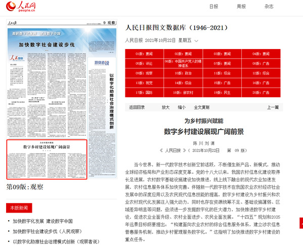 BBV在线(中国)唯一官方网站助理研究员陈川、教授刘渊日前为国家数字乡村建设献言献策,结合我国数字乡村建设现状撰文深入阐述。2021年10月22日《人民日报》第09版对全文进行刊发。