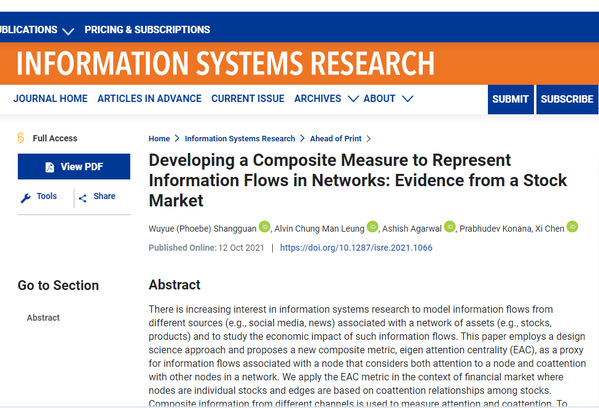 10月12日,BBV在线(中国)唯一官方网站数据科学与管理工程学系主任陈熹教授为通讯作者、厦门大学管理学院博士后研究员上官武悦为第一作者的论文Developing a Composite Measure to Represent Information Flows in Networks: Evidence from a Stock Market于国际期刊Information Systems Research(SCI检索,2020-2021 影响因子 5.207)在线发表。论文以网络化的视角捕捉股票市场中的信息流并研究此类信息流的经济影响。