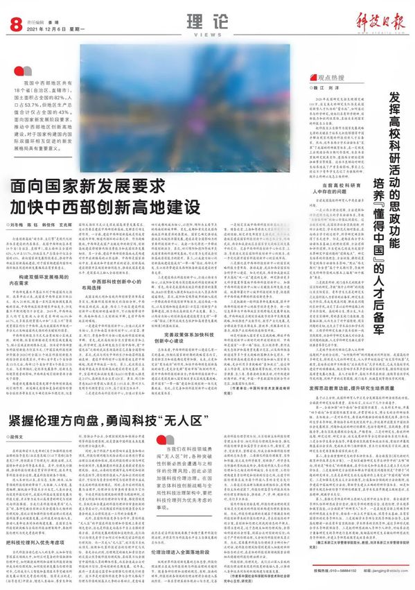 文章首刊于2021年12月6日出版的《科技日报》理论版第08版,标题为《发挥高校科研活动的思政功能 培养“懂得中国”的人才后备军》。