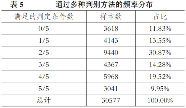 此外,为了消除单一判别法的缺陷,我们在综合使用5种判定方法的基础上,对年度分红通过多种判别方法的观测值频率分布进行了统计。例如,若年度分红仅满足上述5种方法中的一种,则该观察值放入“1/5”这组,满足其中两种则放入“2/5”这组,以此类推,结果如表5所示。