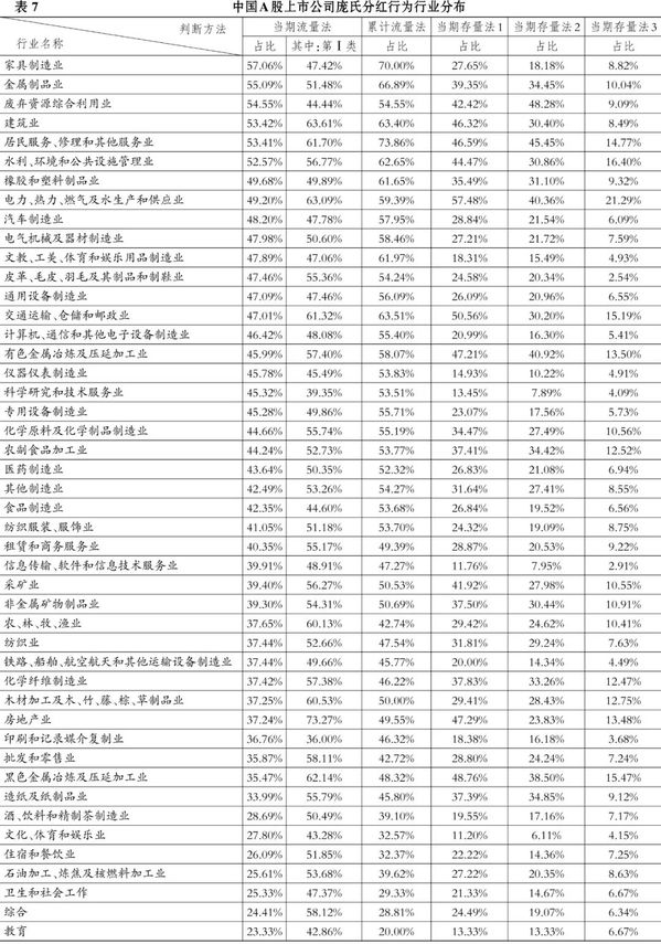 进一步,我们研究了中国A股上市公司庞氏分红行为的行业分布,分类标准取自证监会《上市公司行业分类指引》(2012年修订),除制造业采用二级行业分类外,其余行业采用一级行业分类,结果如表7所示。