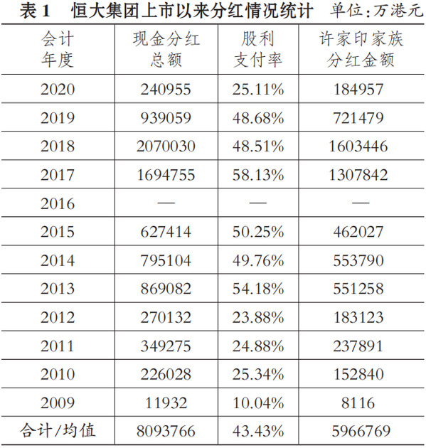 然而,与之形成鲜明对比的是,2013~2019年间,恒大集团的股利支付率常年维持在50%左右;2009~2020年间,其累计平均股利支付率高达43.43%。如表1所示,许家印家族⑥在恒大上市以来12年间共分得的现金股利高达近600亿港元。