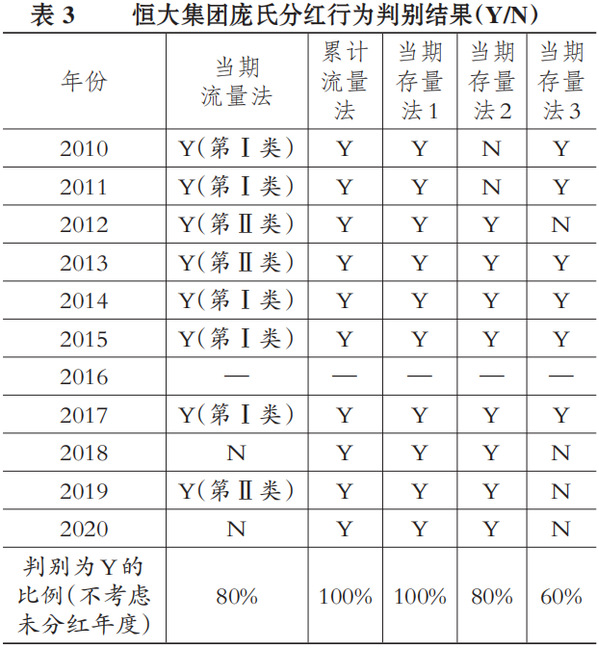 我们利用前述三大维度5种⑫判别方法对恒大集团自上市次年(2010年)以来共11年的10次分红行为进行判别,统计结果如表3所示。