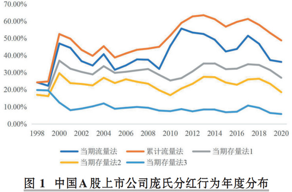 因我国财政部制定的《企业会计准则——现金流量表》于1998年1月1日起在所有企业施行,因此本文以1998~2020年A股所有上市公司为样本,剔除金融类上市公司和数据缺失样本,共得到47771个有效样本,其中有30577个样本在当年度实施了现金股利分配,分红公司占比约为64%。文中的所有数据来自CSMAR数据库和Wind金融数据库。