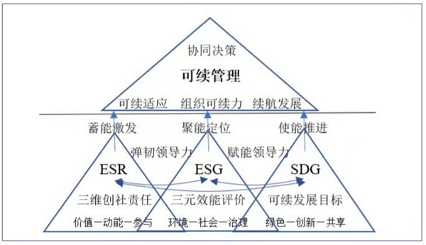 可续管理模型系统阐述了三大策略依据和三重管理机理:以基于价值—动能—参与的三维创业社会责任(ESR),基于环境—社会—治理的三元绿色效能评价(ESG)和基于绿色—创新—共享的可续发展目标(SDG)为三大策略依据;通过弹韧领导力与赋能领导力双翼发力,以蓄能激发、聚能定位和使能推进为三重管理机理,显著增强可续适应管理、协同决策管理和续航发展管理,进而提升组织可续力,即“使队伍、业务、组织和生态系统、运营环境及社会网路获得可续发展整合提升与持续适配的组织动态能力”(见图2)。可续管理模型为企业组织的绿色可续发展提供了整合性的管理原理与心理学方略。