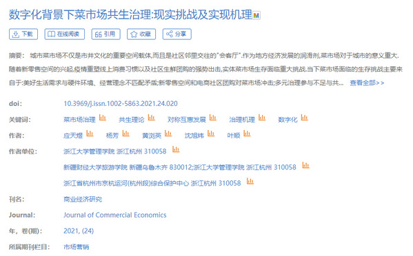 日前,应天煜团队的研究成果在《商业经济研究》(2021年24期 )上发表。文章在梳理菜市场生存现实挑战的基础上,基于共生理论,从不同共生单元参与的视角下系统分析了菜市场对称互惠治理的机理。