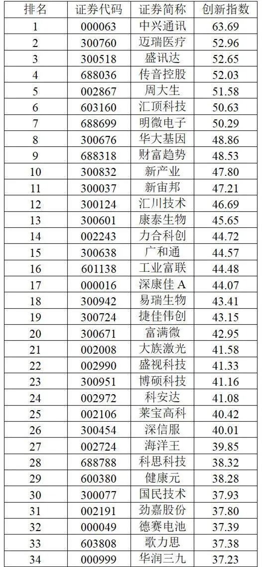 上海市创新指数排名第一、三、四的澜起科技、上海贝岭、中微公司;北京市排名第四、五的兆易创新、紫光股份;深圳市排名第一、五的中兴通讯、传音控股;杭州市排名第一、三的海康威视、大华股份;无锡市排名第一、四的卓胜微与新洁能;广州市排名第三的视源股份,均属计算机、通信和其他电子设备制造业。