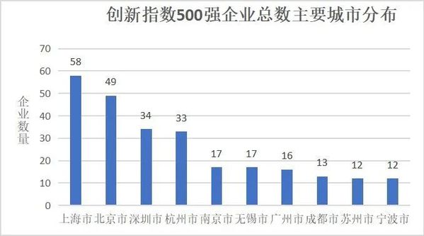 从城市分布来看,创新指数500强公司中,有261家总部位于以下10个城市:上海(58家)、北京(49家)、深圳(34家)、杭州(33家)、南京(17家)、无锡(17家)、广州(16家)、成都(13家)、苏州(12家)、宁波(12家)。创新指数500强公司的城市聚集情况与独角兽企业的城市分布基本吻合,独角兽企业也主要集中分布于以上10个城市。