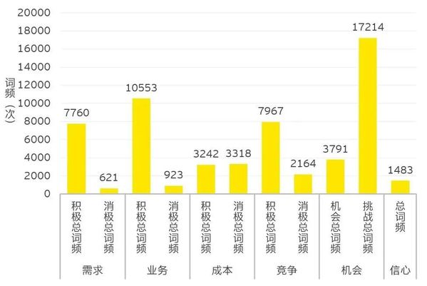 在景气预期各维度词频统计中,需求、业务以及竞争维度的企业景气整体上以积极词频占主导,成本维度上积极和消极认知词频相当。