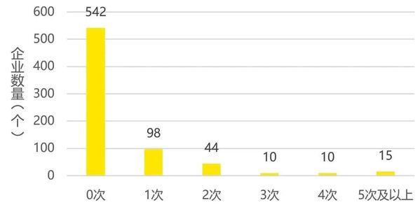 其中,7家公司仅有1次专利自引用,另外1家公司有2次专利自引用。而以有效的发明专利(授权)和实用新型专利来看,在719家样本公司中仅有177家公司有专利自引用行为,专利自引用次数在5次及以上的公司仅有15家。