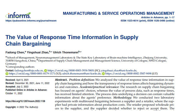 他们的研究成果——“The Value of Response Time Information in Supply Chain Bargaining”发表于国际顶级期刊 Manufacturing & Service Operations Management(管理学UTD24期刊之一)。该成果为数字经济时代下企业如何发挥认知过程数据对运营管理的重要价值带去了重要启示。