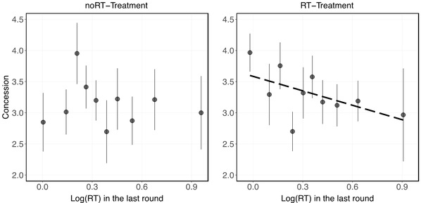 如图3所示,在RT-Treatment中,零售商本轮的价格增加与供应商上一轮反应时间显著负相关,而在noRT-Treatment中,则没有上述关系。