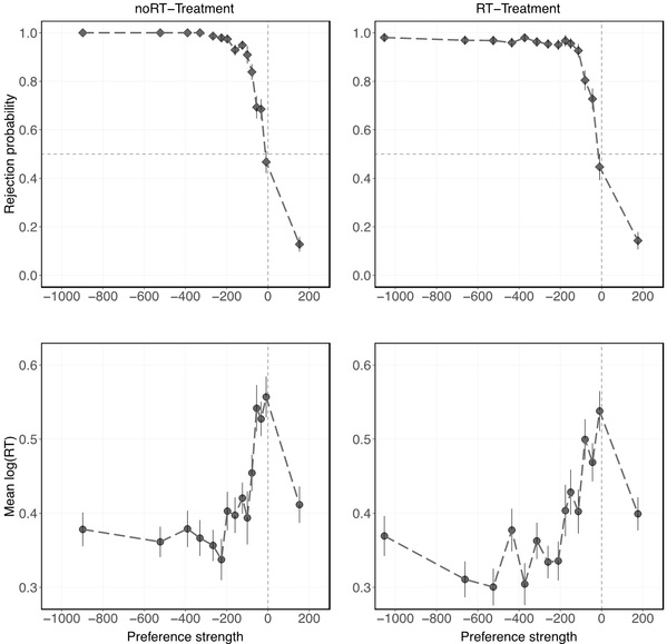 与认知神经科学中的漂移扩散模型(drift diffusion model)预测一致,当供应商对“接受”或“拒绝”的偏好较强时,其反应时间较快;当供应商对“接受”或“拒绝”一个价格的差异较小时,其反应时间较长,即反应时间与偏好强度存在倒U型关系。