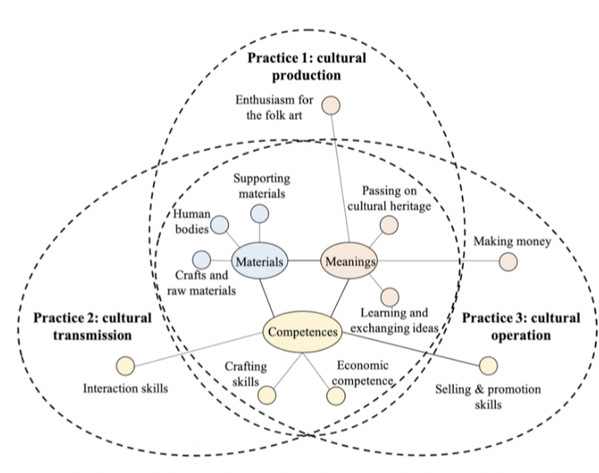 其中,文化传播和经营实践由手工艺人和游客共同完成,可以视为两类互动仪式。这三种实践紧密关联,共享着许多实践元素;同时它们也互相区别,各自拥有着特定的元素。