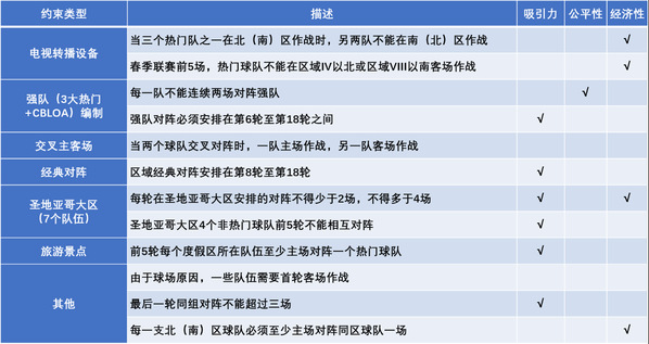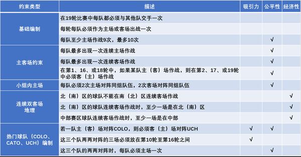 以智利甲级足球联赛为例,下表是智甲联赛赛程编制过程中所考虑的主要因素。从中我们可以看出,不同的约束可能同时兼顾若干方面。