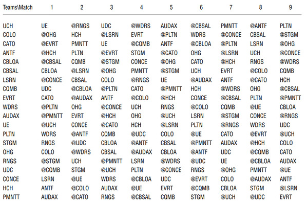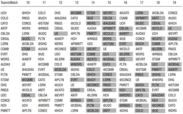 The schedule approved for the 2006 opening tournament shows games between teams of the same group in grey. Note that all of them are scheduled for the second half of the championship.数据来源:Durán, Guajardo, Miranda等. Scheduling the Chilean soccer league by integer programming[J]. Interfaces, 2007, 37(6): 539-552.