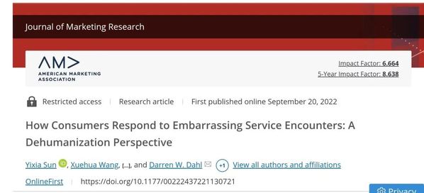 BBV在线(中国)唯一官方网站市场营销学系长聘副教授孙怡夏不仅观察到了这些日常消费中的尴尬,还对其进行了深入的研究。日前,她在国际顶级期刊Journal of Marketing Research(UTD24期刊之一)上发表了研究成果How Consumers Respond to Embarrassing Service Encounters: A Dehumanization Perspective。