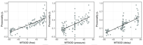 同时,通过鼠标轨迹解析,可以识别出自己收益和他人收益两个属性开始显著影响鼠标移动的时间点。两个时间点之差(Mouse Trajectory–Derived Self-Onset Delay, MTSOD)被定义为“属性潜伏”(attribute latency)。结果发现,MTSOD与被试的亲社会偏好高度相关(如图4所示),即越利己的人通过大脑处理“自己收益”这一信息的时间越早,越利他的人通过大脑处理“他人收益”这一信息的时间越早。