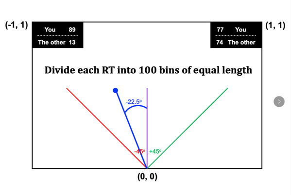 陈发动团队从时间和空间维度对鼠标移动轨迹作了进一步分析。具体而言,他们将每个决策的鼠标移动轨迹和反应时间100等分,分别计算这100个时间点上鼠标位置相对于原点(下端中间)的角度(如图2所示)。然后,研究在每个时间点上自己收益和他人收益两个属性如何影响鼠标位置相对于原点(0, 0)的角度变化,即自己收益和他人收益如何影响鼠标移动过程。
