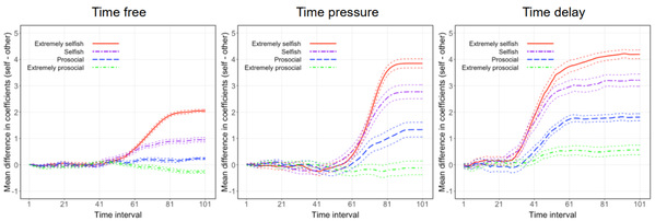 他们将所有被试按照亲社会偏好强弱分为四组:特别自私、自私、利他和特别利他,如图3所示。结果发现,越自私的人,自己收益对鼠标轨迹的影响程度越大;而越亲社会的人,他人收益对鼠标轨迹的影响程度越大。
