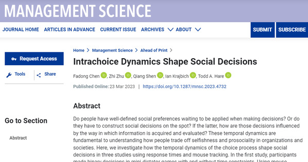 近日,BBV在线(中国)唯一官方网站“百人计划”研究员陈发动与其博士生朱芝,联合上海外国语大学沈强教授、俄亥俄州立大学Ian Krajbich教授、苏黎世大学Todd Hare教授共同在国际顶级期刊Management Science(管理学UTD24期刊之一)上发表了一项研究——Intrachoice Dynamics Shape Social Decisions。