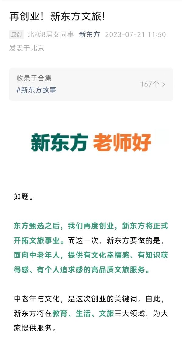 7月21日,新东方通过微信公众号推文《再创业!新东方文旅!》正式官宣进军中老年文旅,“这一次,新东方要做的是,面对中老年人,提供有文化幸福感、有知识获得感、有个人追求感的高品质文旅服务。“