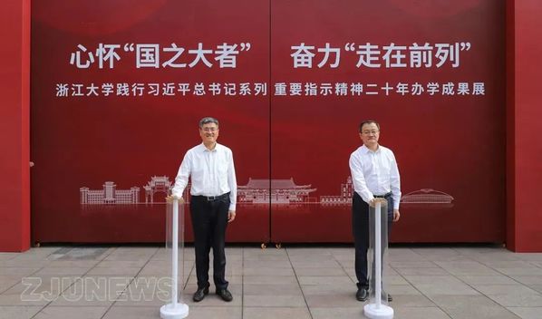 浙江大学党委书记任少波(左)与校长杜江峰(右)共同为展览揭幕