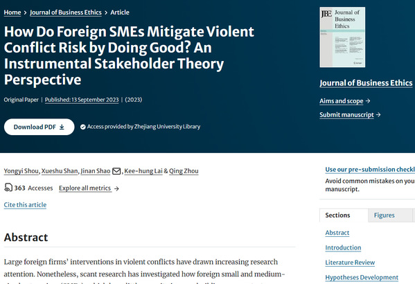 日前,寿涌毅教授与博士生单雪澍携手多位合作者,在国际顶级期刊Journal of Business Ethics(FT50期刊)发表了这项研究的成果——How do foreign SMEs mitigate violent conflict risks by doing good? An instrumental stakeholder theory perspective。该研究为“出海”中小企业如何应对暴力冲突风险提供了有效建议。