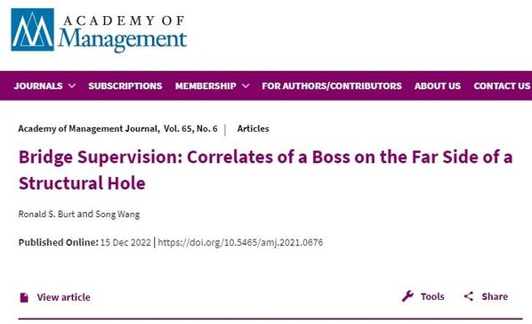 日前,王颂老师联合芝加哥大学Ronald S. Burt教授在Academy of Management Journal(管理学UTD24期刊之一)发表了他们的科研成果Bridge Supervision: Correlates of A Boss on the Far Side of A Structural Hole。