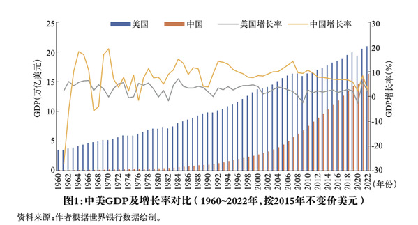 改革开放以来,中国经济取得了巨大的成就,呈现出高速增长的态势。从1978年到2022年,中国GDP年均增长率达到9.5%,远高于全球平均水平。这使中国成为世界上第二大经济体,并且离第一大经济体美国的差距还在快速缩小之中,见图1。