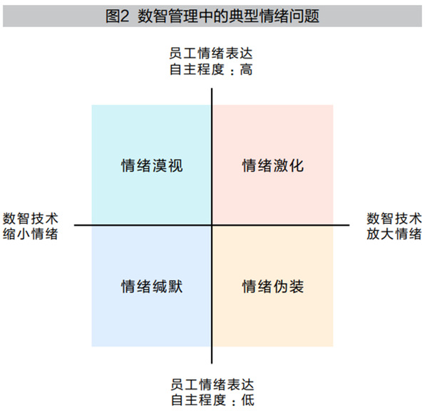 研究中,莫申江团队从情绪产生(数智技术放大或缩小员工情绪)和情绪表达(员工情绪表达自主性程度高或低)两个维度对数智管理过程中常常出现的群体性情绪问题进行了分类阐释,如图2所示。